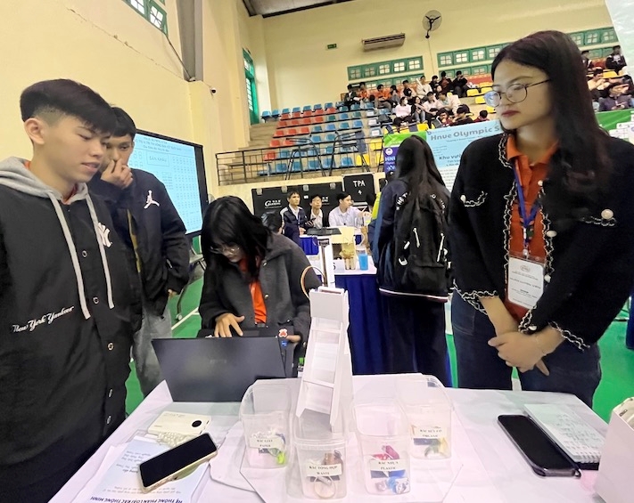 Ba học sinh Trường PTDTNT THCS và THPT Lâm Bình (Tuyên Quang), trong đó có em Nguyễn Thị Nguyên, tranh tài ở hội thi với sản phẩm “Bộ kit khử mùi – tái sinh hạt dưa mèo”.