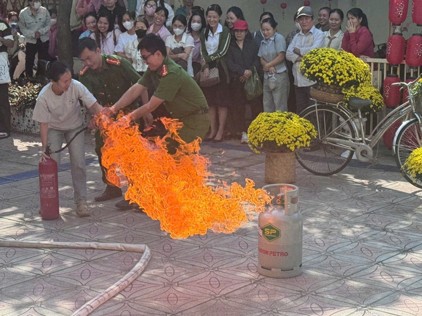 Phần thực hành diễn ra sôi nổi, thu hút sự tham gia tích cực của các học viên. Dưới sự hướng dẫn trực tiếp của cán bộ Công an, các cán bộ, giáo viên đã thực hành thao tác sử dụng bình chữa cháy xách tay, chăn chiên để dập tắt đám cháy giả định từ bình gas, xăng dầu; thực hành kỹ năng thoát nạn, cứu người trong môi trường khói lửa; kiểm tra, bảo dưỡng và sử dụng các phương tiện PCCC. Đặc biệt, các kỹ năng sơ tán trẻ mầm non khi có hỏa hoạn, kỹ năng di chuyển an toàn trong môi trường cháy đã được hướng dẫn kỹ lưỡng, sát với thực tế.