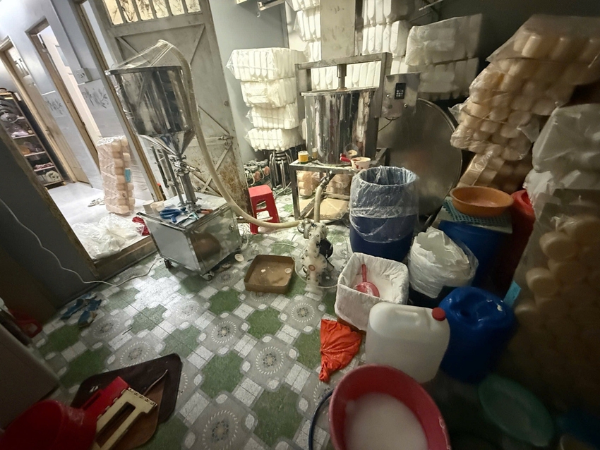 | Hình ảnh tại nơi điều chế, pha chế mỹ phẩm giả vừa bị triệt phá. Ảnh C.A |