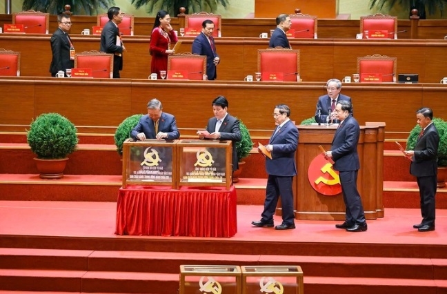 | Tổng Bí thư Tô Lâm, Chủ tịch nước Lương Cường, Thủ tướng Phạm Minh Chính, Chủ tịch Quốc hội Trần Thanh Mẫn, Thường trực Ban Bí thư Trần Cẩm Tú bỏ phiếu bầu Ban chấp hành Trung ương Đảng khóa XIV, chiều 22-1 - Ảnh: TTXVN |
