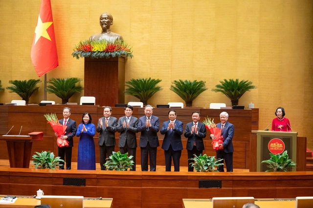 | Lãnh đạo Đảng, Nhà nước tặng hoa chúc mừng các nhân sự mới. (Ảnh: P.Thắng/Quốc hội). |