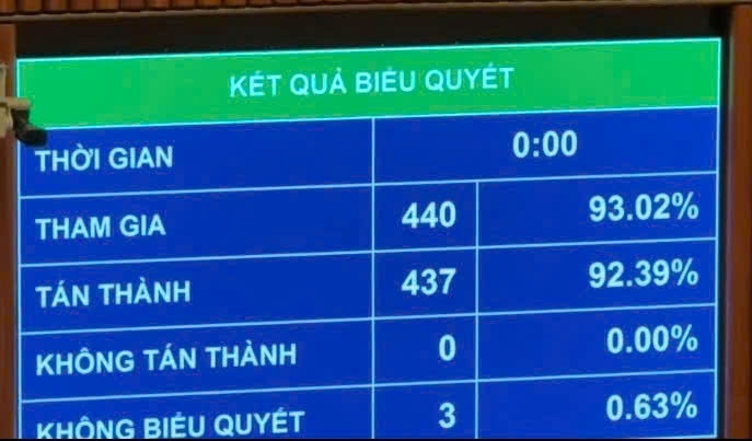 | Với 437 đại biểu Quốc hội tán thành, Quốc hội đã thông qua Luật Báo chí (sửa đổi). (Ảnh: Media QH) |