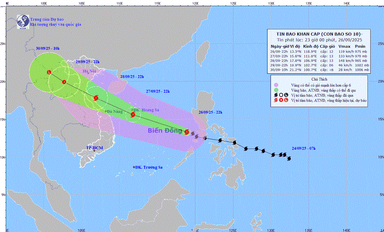 Tối 26/9, bão số 10 (Bualoi) đã đi vào vùng biển phía Đông của khu vực giữa Biển Đông và trở thành cơn bão số 10 trong năm 2025.