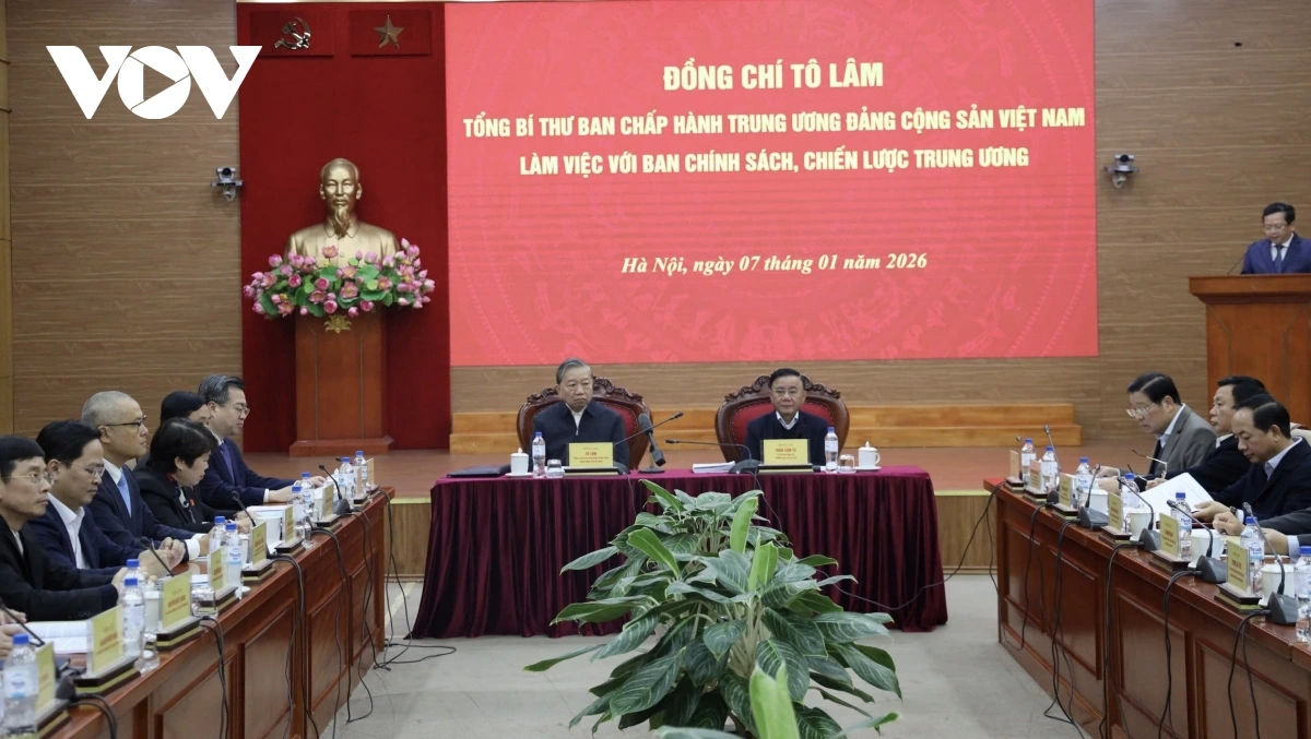 Sáng nay (7/1) tại Hà Nội, Tổng Bí thư Tô Lâm tới thăm và chủ trì buổi làm việc với Ban Chính sách và Chiến lược Trung ương về việc xây dựng một số Nghị quyết trình Hội nghị Trung ương khoá 14. Cùng dự có Thường trực Ban Bí thư Trần Cẩm Tú, Trưởng Ban Nội chính Trung ương Phan Đình Trạc; Nguyễn Xuân Thắng, Giám đốc Học viện Chính trị Quốc gia Hồ Chí Minh, Chủ tịch Hội đồng Lý luận Trung ương; Trưởng Ban Tuyên giáo và Dân vận Trung ương Trịnh Văn Quyết và lãnh đạo một số Bộ ngành Trung ương.