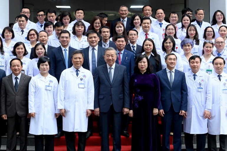 | Tổng Bí thư Tô Lâm với các đại biểu và cán bộ, nhân viên y tế Bệnh viện Hữu Nghị. (Ảnh: ĐĂNG KHOA) |