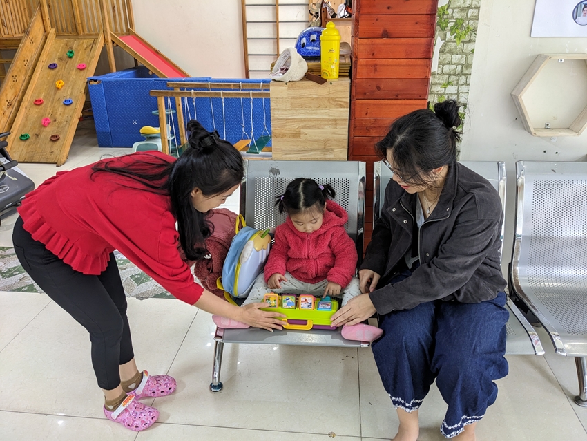 Mặc dù đã ra ôm cổ mẹ đến đón về nhưng bé N.N.T.U., 2,5 tuổi, vẫn quay sang ‘gạ’ cô Dương Thị Dung: “Cô ơi, con muốn chơi đồ chơi”. Ngồi trên ghế, nhận đồ chơi, bé nhoay nhoáy bấm các phím, miệng líu lo: “Con cá sống ở dưới sông. Con hươu cao cổ sống ở trong rừng. Con gà,...”. Chị N.T.N.B. vui mừng cho biết: “Trước đây con chậm nói nhưng nay đã nói được rất nhiều và sõi. Tôi sẽ cho con học ở trung tâm đến 3 tuổi rồi mới cho đi học mẫu giáo theo tư vấn của các cô giáo”.