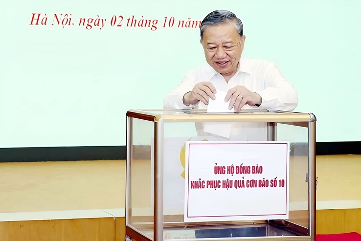 Tổng Bí thư Tô Lâm ủng hộ đồng bào khắc phục hậu quả cơn bão số 10. (Ảnh: TTXVN) |