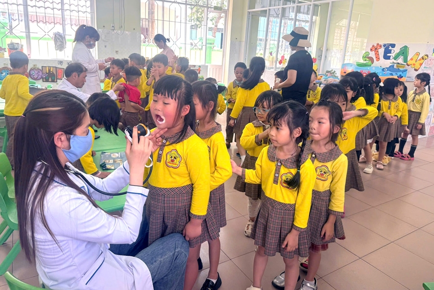 | Trẻ mầm non tại phường Lâm Viên - Đà Lạt được khám sàng lọc bệnh tay chân miệng. (Ảnh: An Nhiên) |