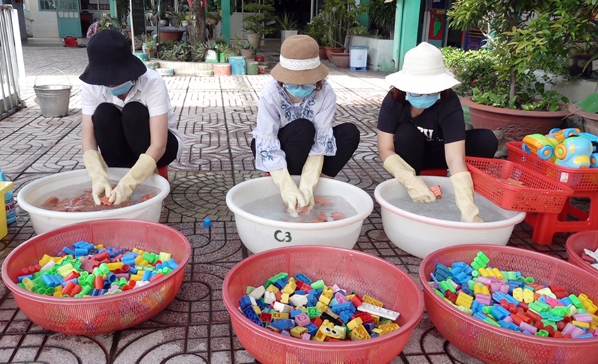 | Công tác vệ sinh, khử khuẩn đồ chơi và bề mặt tiếp xúc được các trường mầm non trên địa bàn Hà Nội thực hiện nghiêm ngặt trong đợt cao điểm phòng chống bệnh tay chân miệng. |