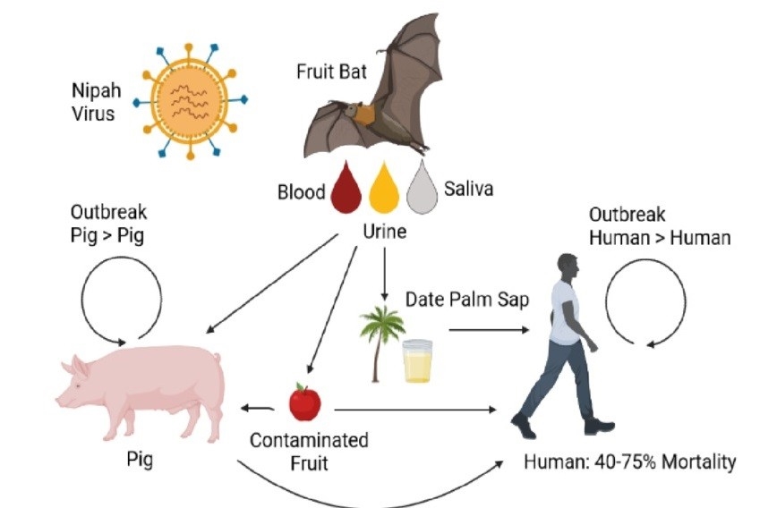 | Virus Nipah lây truyền chủ yếu từ dơi ăn quả sang các vật chủ trung gian hoặc lây trực tiếp sang người qua thực phẩm nhiễm mầm bệnh. |