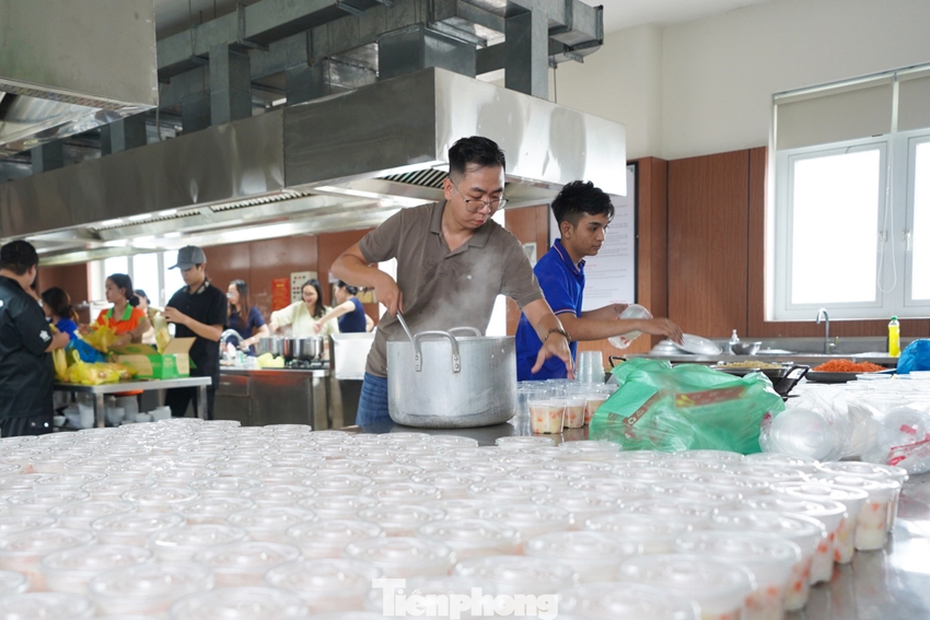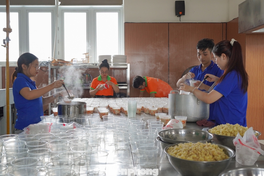 | Hàng chục tình nguyện viên hăng hái tham gia phụ giúp. Những bếp cơm dã chiến được tổ chức, mượn tạm trường học, nhà dân... Các đoàn viên thanh niên chia nhau phụ giúp các khâu, từ sơ chế, đến nấu nướng, đóng gói và vận chuyển đến các khu dân cư. |