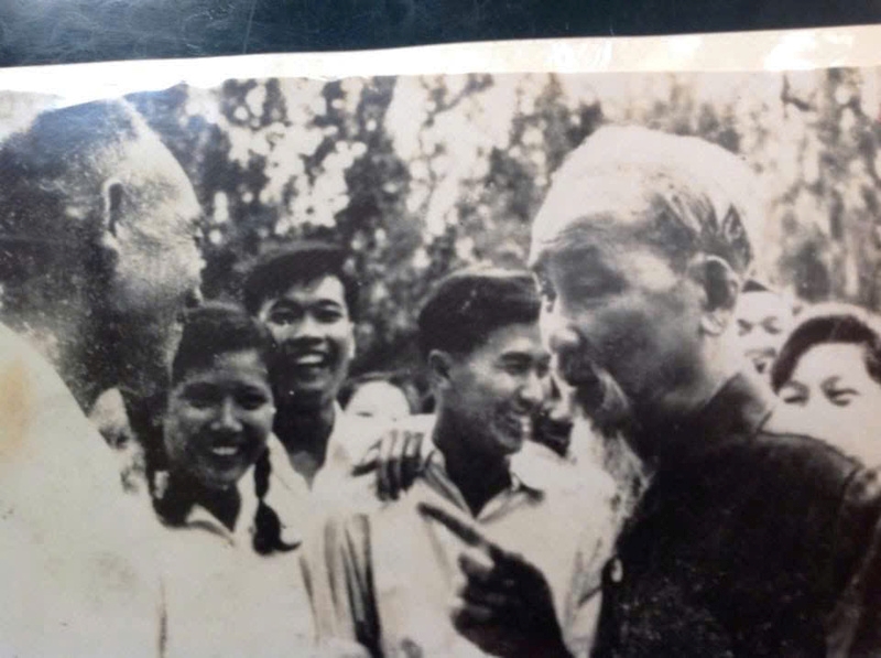| Cụ Nguyễn Thị Trong (thời trẻ, tết tóc) trong một lần được vinh dự gặp Bác Hồ ở Bắc Kinh. Ảnh: NVCC |