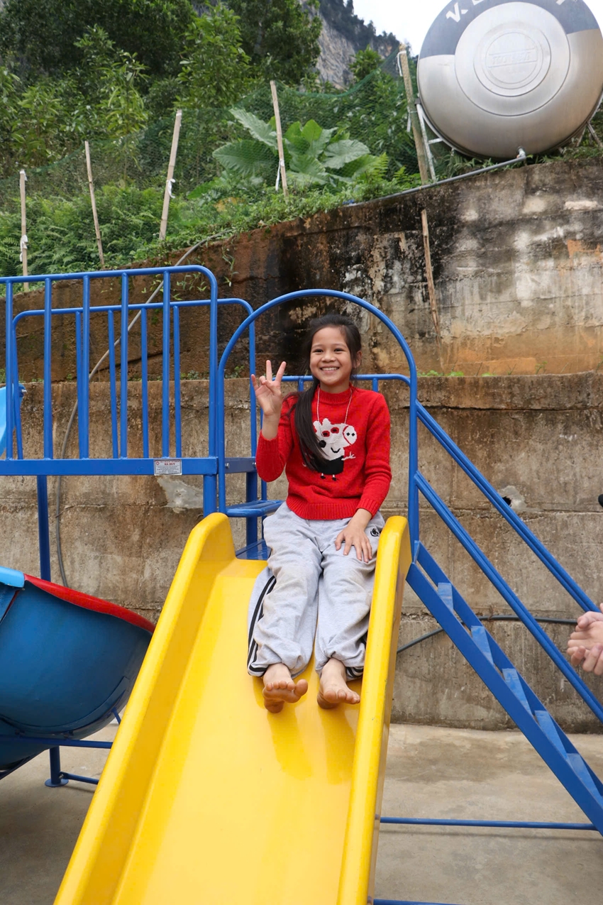 | Hình ảnh các tình nguyện viên cùng các em học sinh bên công trình “Cầu trượt ước mơ”. |