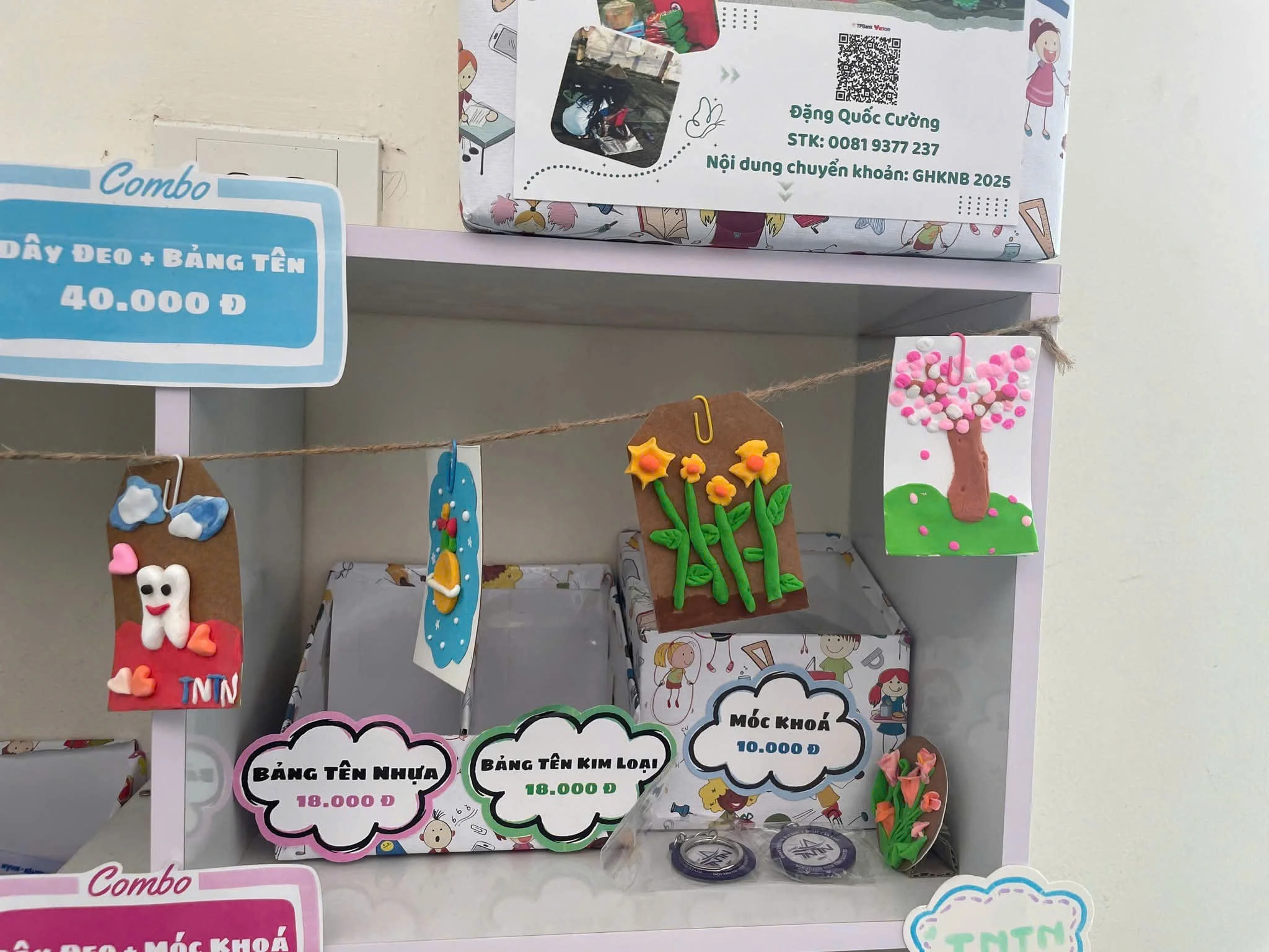 Những mặt hàng như: móc khóa, chậu cây đá tí hon, sổ tay, dây đeo bảng tên… được sắp xếp ngay ngắn. Trên kệ, một chiếc hộp giấy nhỏ xinh đặt ngay ngắn, kèm tấm bảng hướng dẫn: "Bạn có thể chọn món mình thích, bỏ tiền vào hộp hoặc quét mã QR. Mọi khoản thu sẽ dành cho hoạt động thiện nguyện".