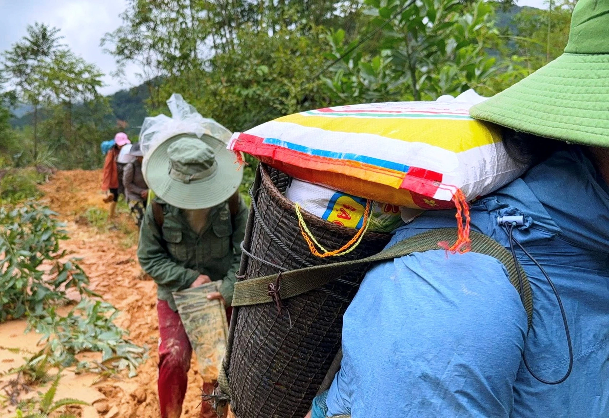 "Cả thôn bị cô lập rồi, mình không gùi thì bà con trong đó lấy gì ăn. Mình còn sức, còn chân, thì phải đi thôi", anh Cơlâu Dũng quả quyết. Gùi của anh nặng gần 20 kg, toàn mì tôm, gạo, muối và vài chiếc áo ấm. "Đường sạt, nhiều đoạn phải bò qua. Có chỗ đất sụt, bùn lút đến đầu gối. Nhưng nghĩ đến bà con đang bị cô lập, mình phải cố gắng bước tiếp", anh nói với chất giọng khàn trong gió núi.
