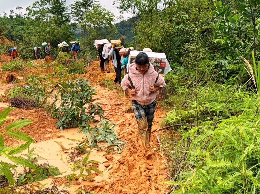Trên vai những người đàn ông là bao gạo nặng, còn những người phụ nữ là áo ấm, thùng mì tôm… Có cả những bàn tay nhỏ xíu, non nớt, vẫn cố giữ thăng bằng giữa con dốc trơn như đổ mỡ. Giữa đoàn người ấy, cô bé Arâl Thị Linh, chừng 15 tuổi, trong chiếc áo lông cũ màu hồng, đôi chân lấm đất, vai gùi một chiếc gùi to hơn cả vóc dáng, bên trong là vài bộ quần áo ấm, thùng mì tôm. Không ai bảo em phải gùi. Nhưng khi được hỏi, em chỉ mỉm cười, nói nhỏ: "Mưa lũ nhưng nhà em không bị sao cả. Em thấy nhiều người dân còn bị cô lập nên gùi được chút nào thì giúp bà con".
