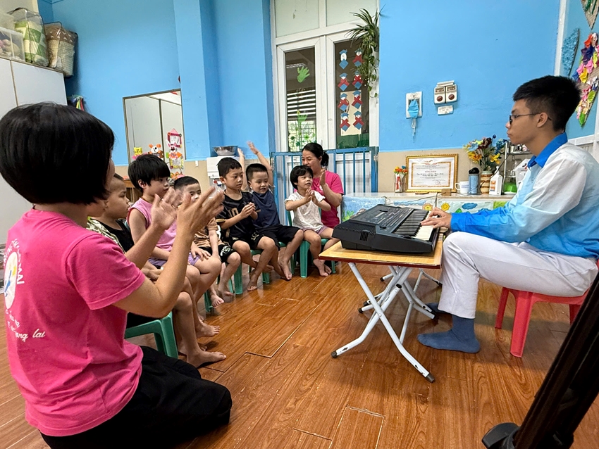 | Nguyễn Hoàng Phương, một học sinh cũ của trung tâm, đến dạy nhạc cho các em nhỏ. |
