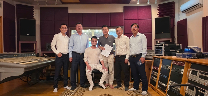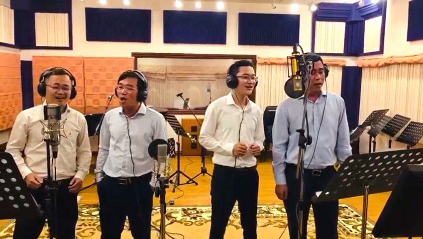 | Các bác sĩ thể hiện ca khúc âm nhạc "Trái tim chữa lành trái tim" trong phòng thu âm. |