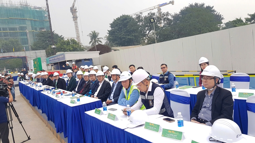| Các đồng chí lãnh đạo, đại biểu, đại diện đơn vị chủ đầu tư, nhà thầu, các công nhân người lao động tham dự tại chương trình. (Ảnh: Đại Lộc) |