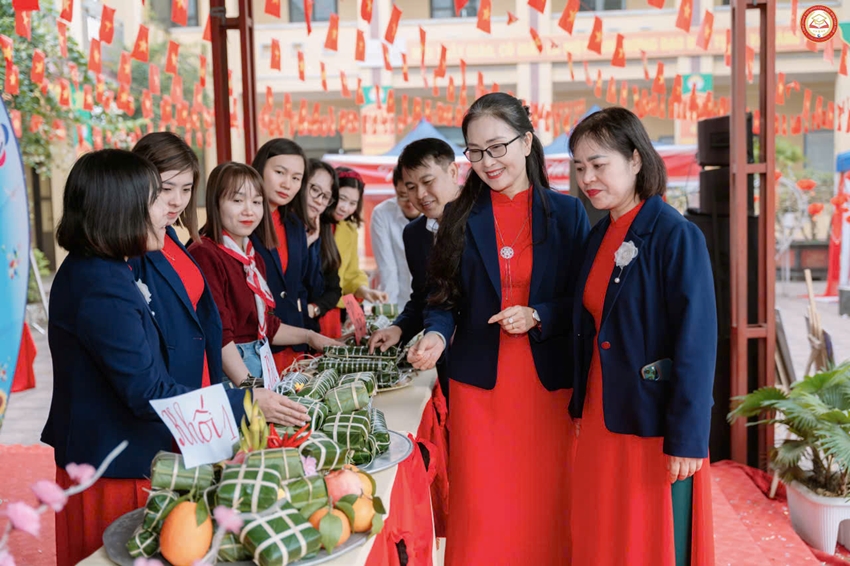 Thầy Cô giáo vui mừng khi tham gia chương trình ngày hội trải nghiệm Xuân Yêu thương, và chấm thi các sản phẩm gói bánh chưng của các khối học sinh.
