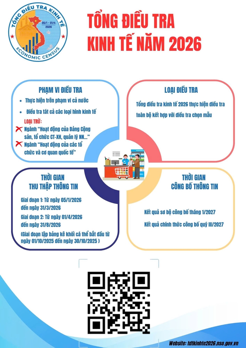 Hình ảnh tuyên truyền Tổng điều tra kinh tế năm 2026, và mã QR để truy cập thông tin. (Ảnh: CTK/BTC)