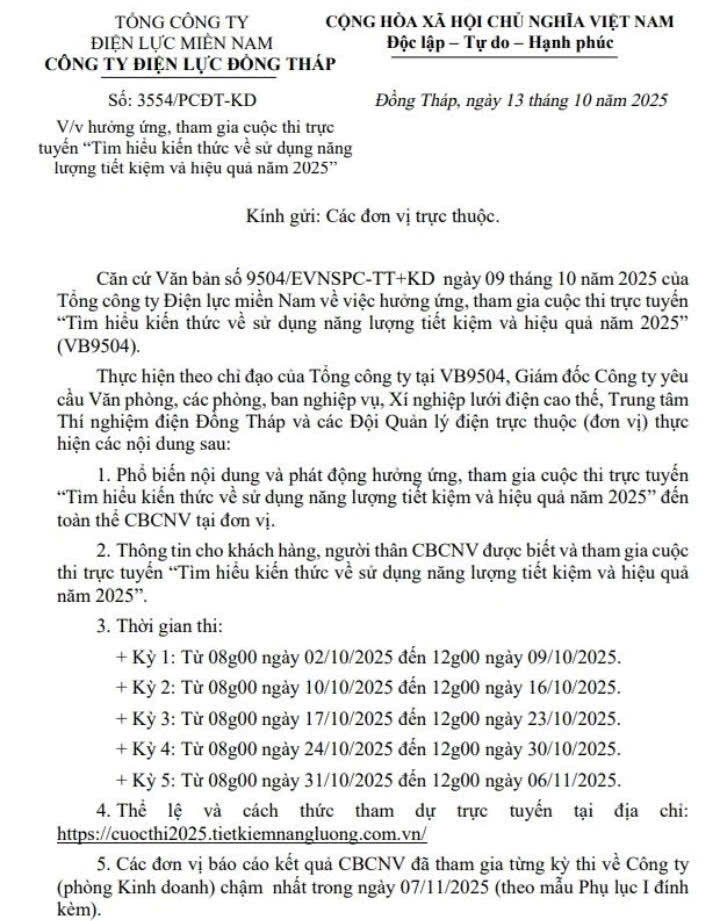 Công ty Điện lực Đồng Tháp đã ban hành văn bản số 3554/PCĐT-KD ngày 13/10/2025, vận động toàn thể cán bộ, công nhân viên tích cực tham gia. Đơn vị cũng tích cực truyền thông, vận động khách hàng và người thân của cán bộ, công nhân viên công ty cùng dự thi, góp phần lan tỏa thông điệp “Tiết kiệm điện – trách nhiệm và thói quen” đến cộng đồng.