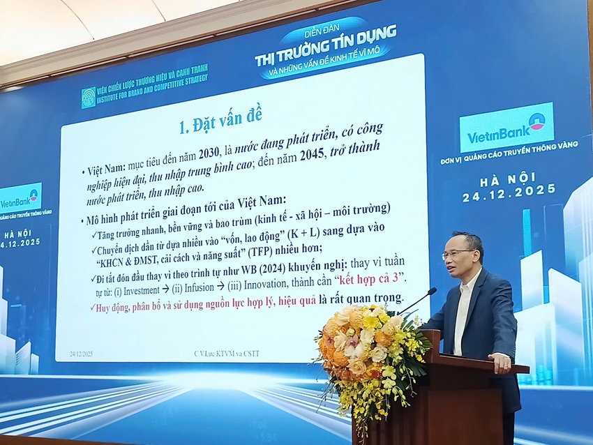 Sáng 24/12/2025, tại Hà Nội, Viện Chiến lược thương hiệu và cạnh tranh (BCSI) phối hợp với các đơn vị liên quan, cùng với sự đồng hành của VietinBank, đã tổ chức: Diễn đàn “Thị trường Tín dụng và những vấn đề kinh tế vĩ mô”. Chương trình nhằm rà soát, thảo luận và hoàn thiện chính sách liên quan quản lý tín dụng theo hướng ổn định, hiệu quả và bền vững.