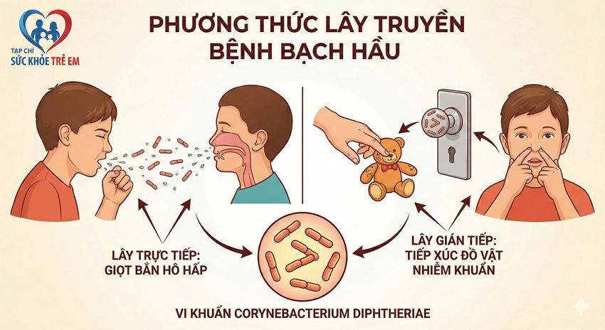 Vi khuẩn bạch hầu có sức sống khá tốt ở môi trường bên ngoài và lây lan cực mạnh qua đường hô hấp. Phụ huynh cần cảnh giác cao độ với hai con đường lây nhiễm chính: