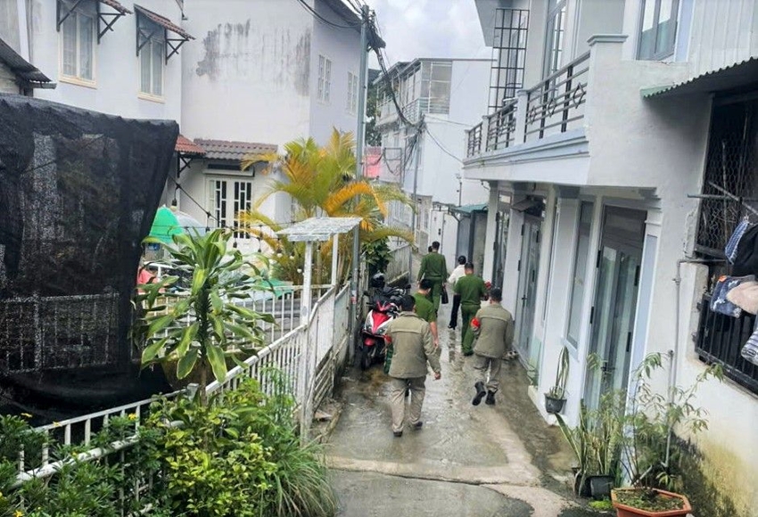 | Cảnh sát trên đường vào làm việc tại nhà riêng một số cán bộ, công chức thuộc Sở Y tế Lâm Đồng. Ảnh: Phúc Khánh  |