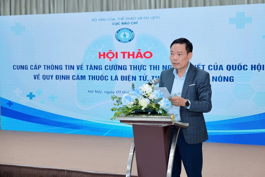 Chiều ngày 01/12/2025, tại Hà Nội, Cục Báo chí (Bộ Văn hoá, Thể thao và Du lịch), phối hợp Tổ chức Y tế thế giới (WHO) tại Việt Nam, đại diện cơ quan của Bộ Y tế, các cơ quan liên quan, đã tổ chức "Hội thảo Cung cấp thông tin về Tăng cường thực thi Nghị quyết của Quốc hội về Quy định cấm thuốc lá điện tử, thuốc lá nung nóng".