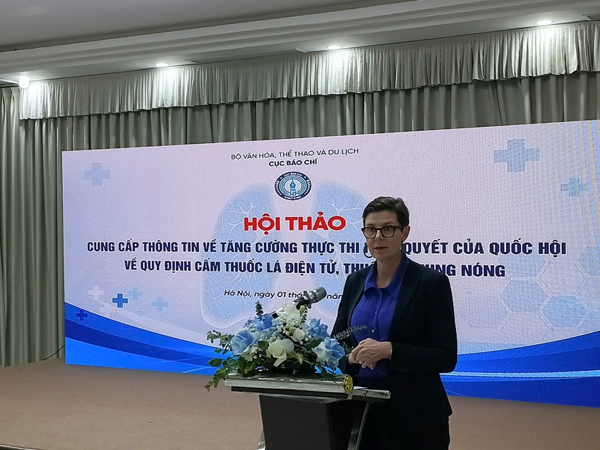 Phát biểu tại hội thảo, TS. Angela Pratt - Trưởng đại diện của Tổ chức Y tế thế giới (WHO) tại Việt Nam, chia sẻ: Kể từ khi Quốc hội bỏ phiếu thông qua lệnh cấm thuốc lá điện tử và nung nóng cách đây một năm, Việt Nam đã được cộng đồng quốc tế ghi nhận về vai trò tiên phong trong việc cấm các sản phẩm thuốc lá điện tử và thuốc lá nung nóng. Đây là quyết định có ý nghĩa rất lớn đối với sức khỏe cộng đồng, đặc biệt là trong việc bảo vệ sức khỏe và tương lai của thế hệ trẻ.