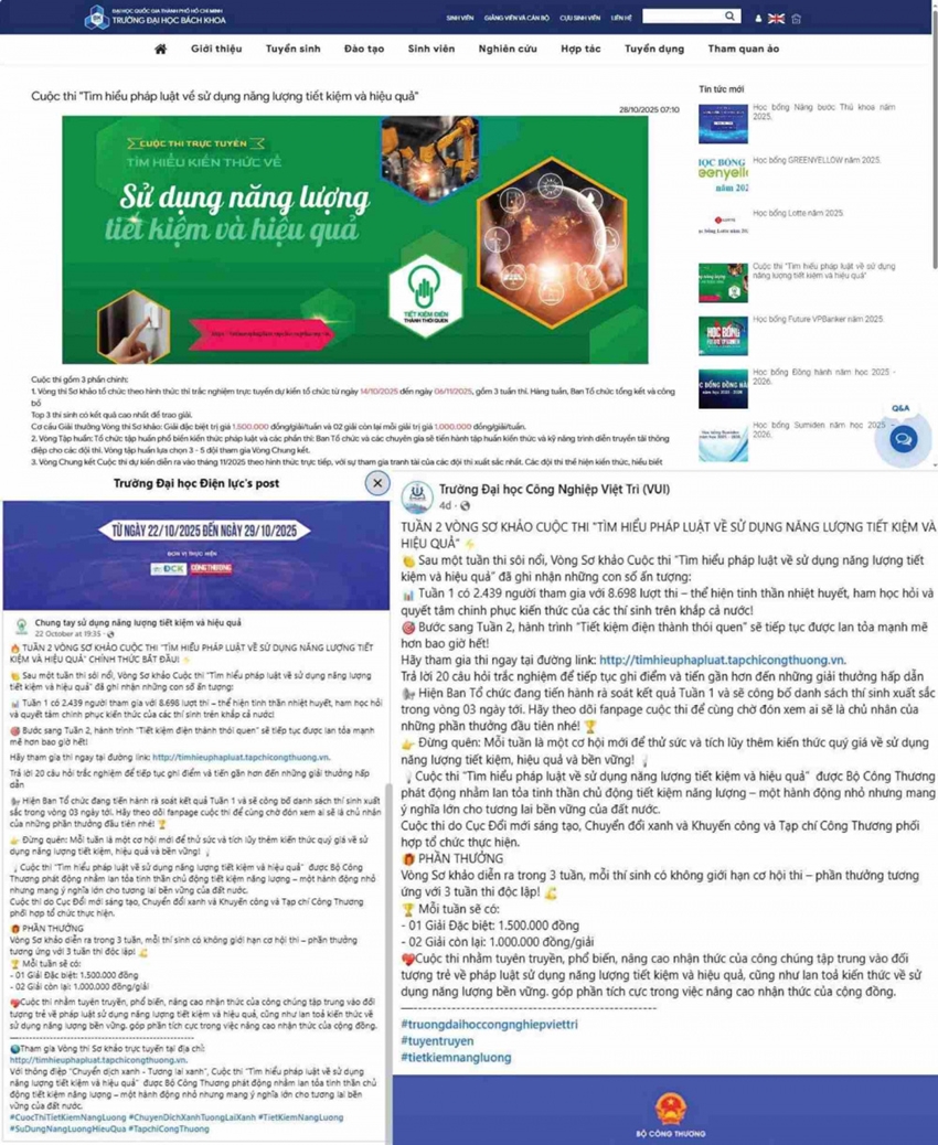 | Trường Đại học Bách Khoa Hồ Chí Minh, Đại học Điện lực, Đại học Công nghiệp Việt Trì tuyên truyền bổ biến Cuộc thi “Tìm hiểu pháp luật về sử dụng năng lượng tiết kiệm và hiệu quả” các nhà trường đã tích cực tuyên truyền thông qua trang web, fanpage của trường. |