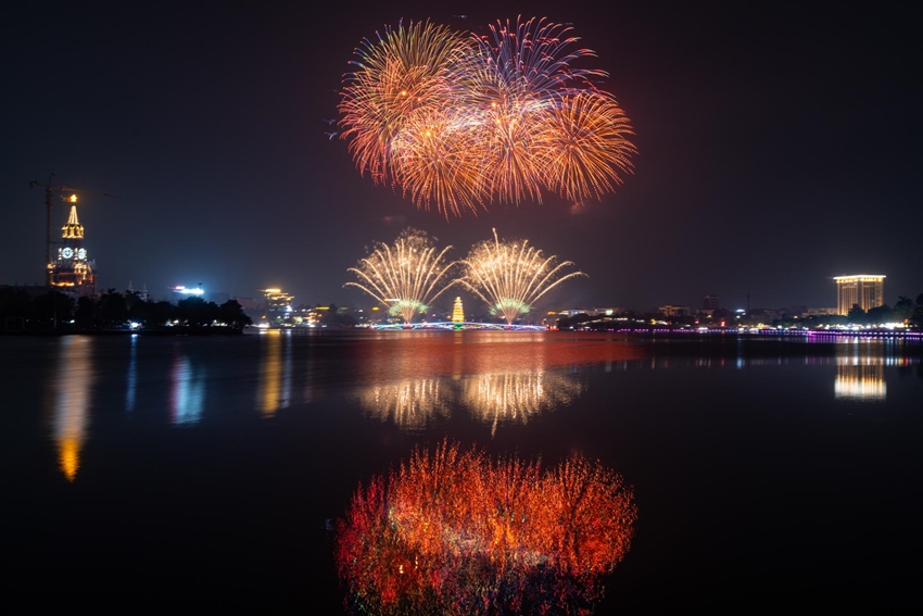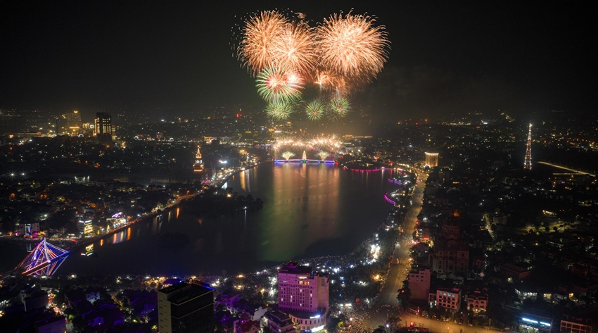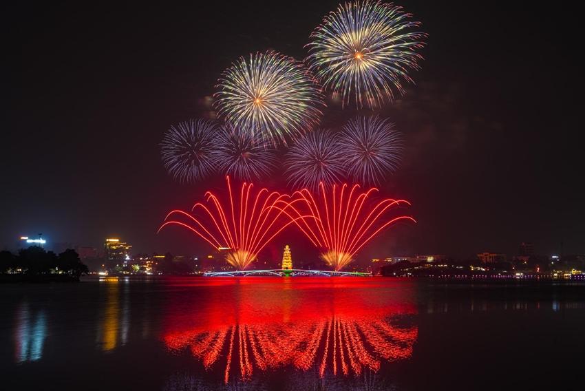 | Những chùm pháo hoa nhiều màu sắc liên tục được bắn lên cao tại khu vực hồ Công viên Văn Lang (Việt Trì, tỉnh Phú Thọ). |