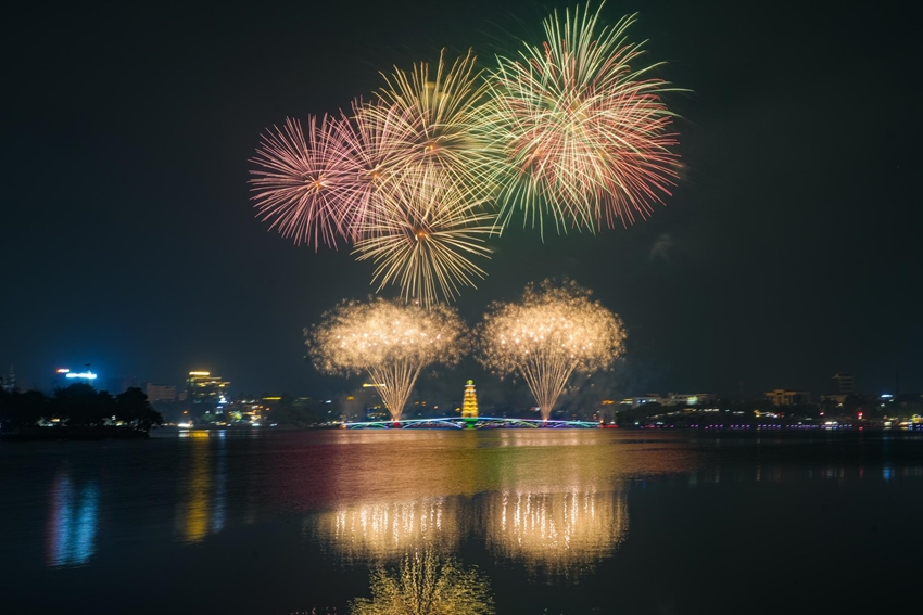 | Những chùm pháo hoa nhiều màu sắc liên tục được bắn lên cao tại khu vực cầu Tiên Dung ở hồ Công viên Văn Lang (Việt Trì, tỉnh Phú Thọ). |