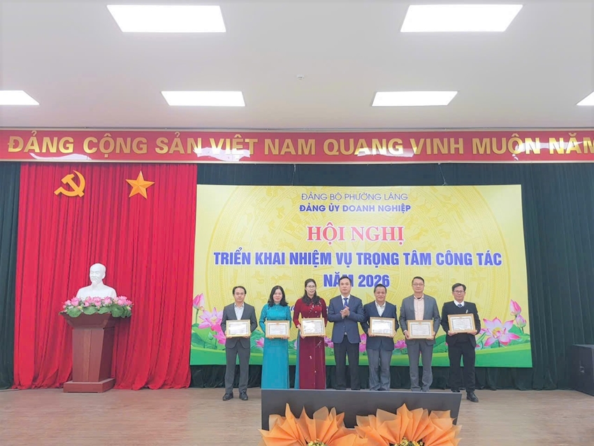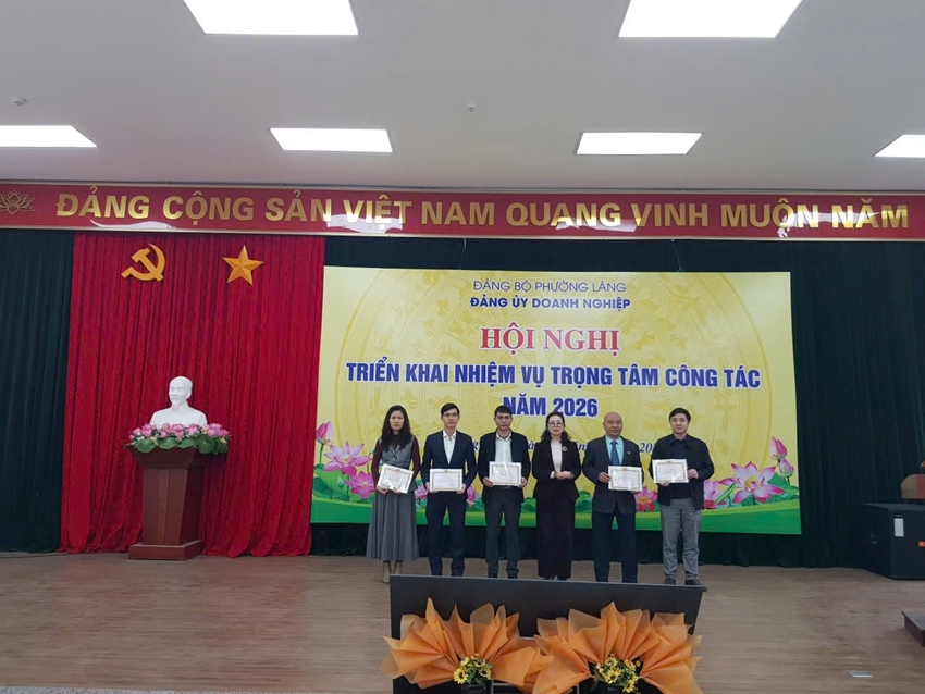 | Bí thư Đảng ủy phường Láng, Chủ tịch HĐND - ông Nguyễn Hồng Dân, và lãnh đạo Đảng ủy Doanh nghiệp Phường Láng trao tặng Giấy khen cho đại diện tập thể có thành tích hoàn thành nhiệm vụ công tác năm 2025. (Ảnh: Đại Lộc) |