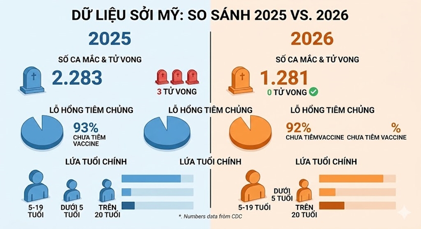 Dữ liệu thống kê cho thấy sự lây lan của bệnh sởi hiện nay chủ yếu mang tính tập trung. Trong những tháng đầu năm 2026, Mỹ đã báo cáo 12 ổ dịch mới. Khoảng 89% số ca mắc được xác nhận (1.137/1.281 ca) có liên quan trực tiếp đến các ổ dịch này.