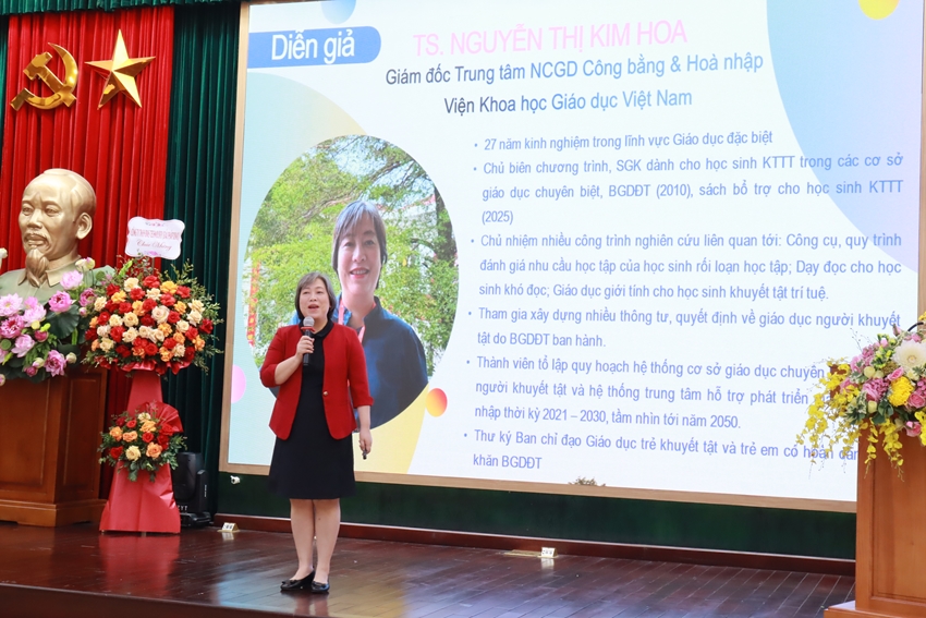 | Tiến sĩ Nguyễn Thị Kim Hoa, Giám đốc Trung tâm Nghiên cứu Giáo dục Công bằng và Hòa nhập, Viện Khoa học Giáo dục Việt Nam chia sẻ tại Hội thảo. |