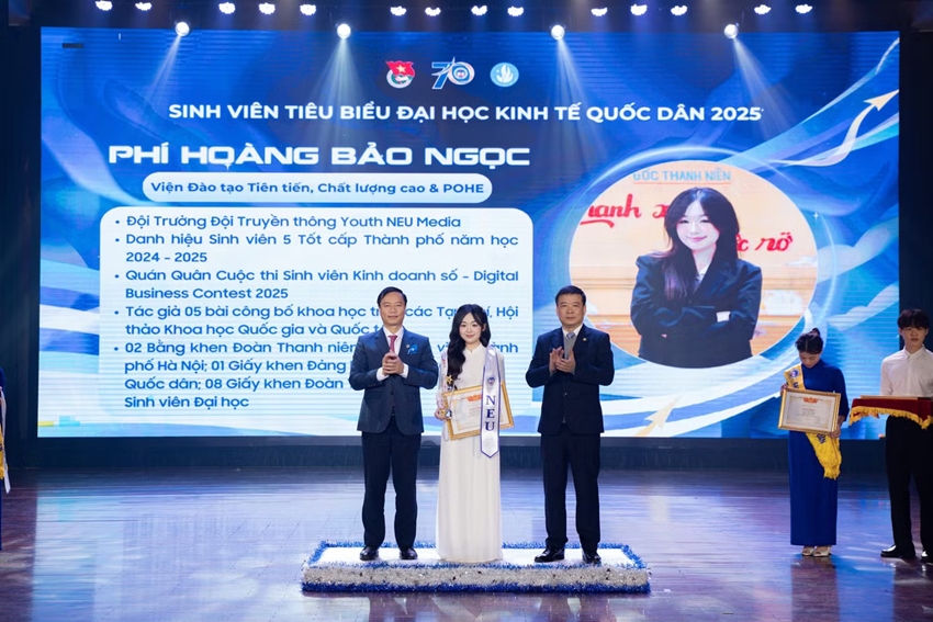 | Giám đốc Đại học Kinh tế Quốc dân và Bí thư Đảng uỷ, Chủ tịch Hội Đồng trường tuyên dương, khen thưởng danh hiệu “Sinh viên Tiêu biểu” năm 2025 cho Phí Hoàng Bảo Ngọc với bảng thành tích ấn tượng |
