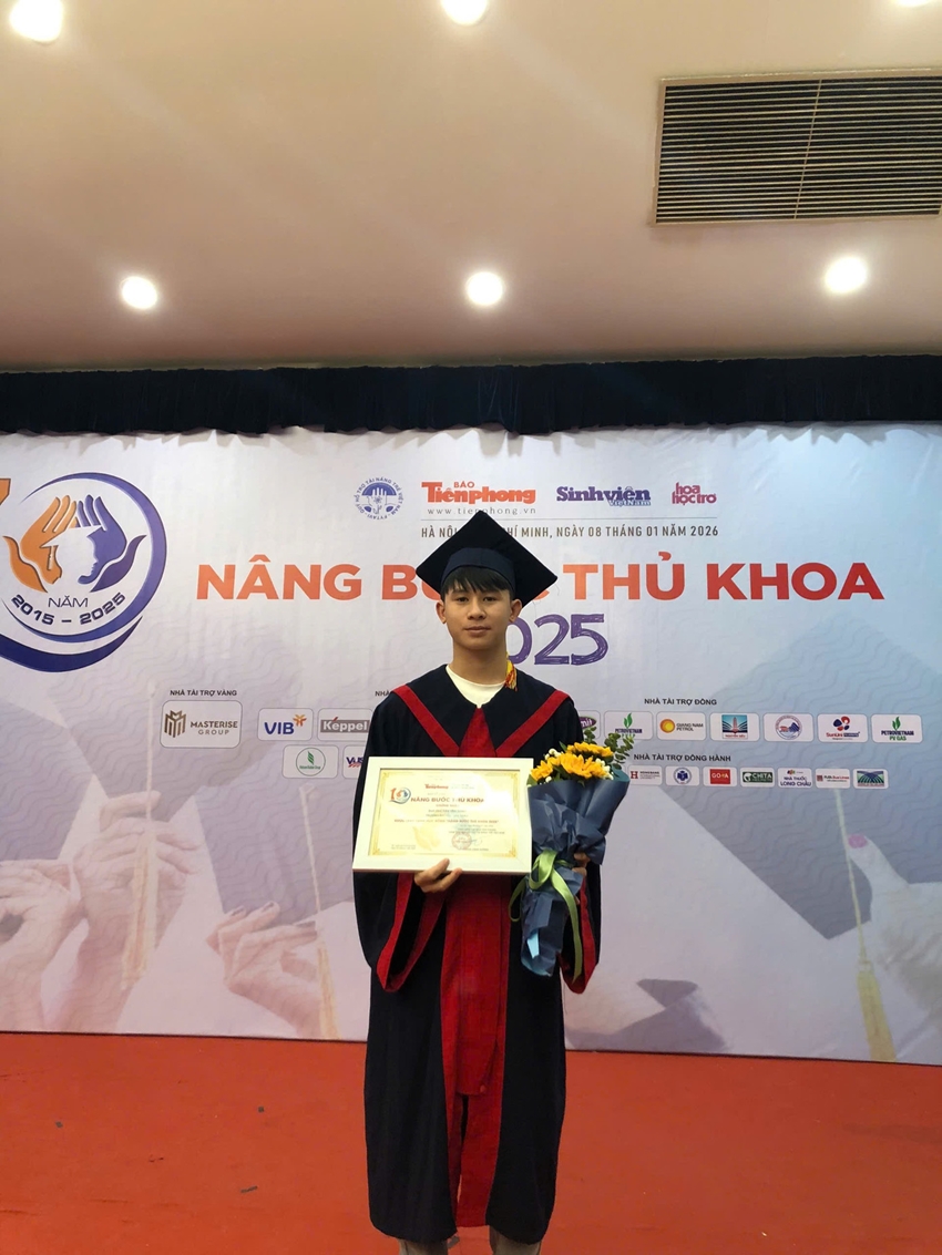 | Sần Văn Thinh nhận học bổng “Nâng nước Thủ khoa 2025” của Báo Tiền Phong. |