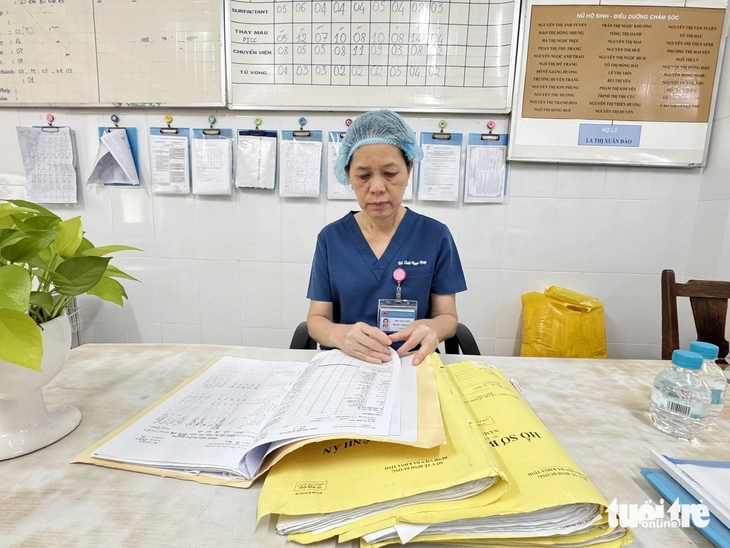 | Bác sĩ Thái Ngọc Điệp, Trưởng khoa sơ sinh của Bệnh viện Đa khoa Bình Dương, xót xa khi lật lại từng trang bệnh án nhi "vô danh" - Ảnh: THU HIẾN |