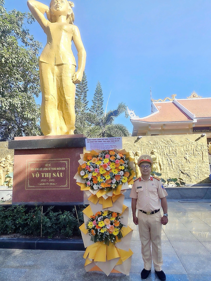 | Đại diện Đoàn Phòng PC08- Thiếu tá Phan Thành Nghĩa - Ủy viên BCH Đoàn Phòng PC08 dâng hoa tại nhà lưu niệm Anh Hùng liệt sĩ Võ Thị Sáu |