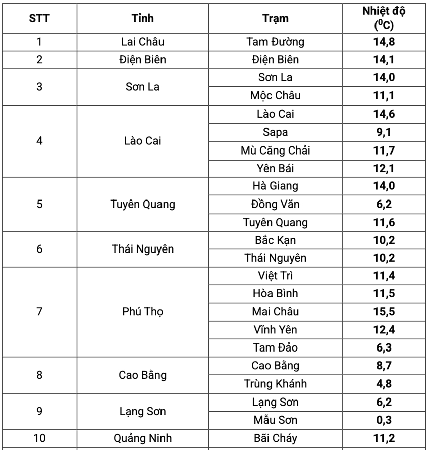 Trung du, đồng bằng Bắc Bộ và Thanh Hóa có nhiệt độ thấp nhất 11-14 độ C, nhiệt độ trung bình 13-15 độ C.
